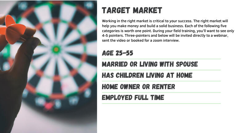 Using the video along with your trainer in front of the target market is crucial to your success. If you work in the right market, you will make money and build a solid team. Your target market is:
